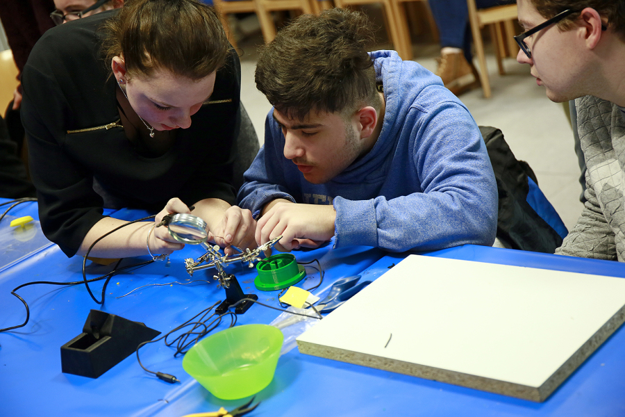 Am 15.03.18 fuhren wir gemeinsam mit den Kindern aus der Liboriusschule zum Schülerlabor ins HNF, um die ersten Taster als Hilfsmittel für die Schüler der Liboriusschule zu bauen. Nach einer kurzen Einführung schliffen wir die mit dem 3d-Drucker hergestellten Einzelteile glatt und löteten im Anschluss die Kabel, Federn und Drucksensoren zu einem funktionierenden Stromkreis zusammen. Am 03.05.18 werden die Taster fertiggestellt.