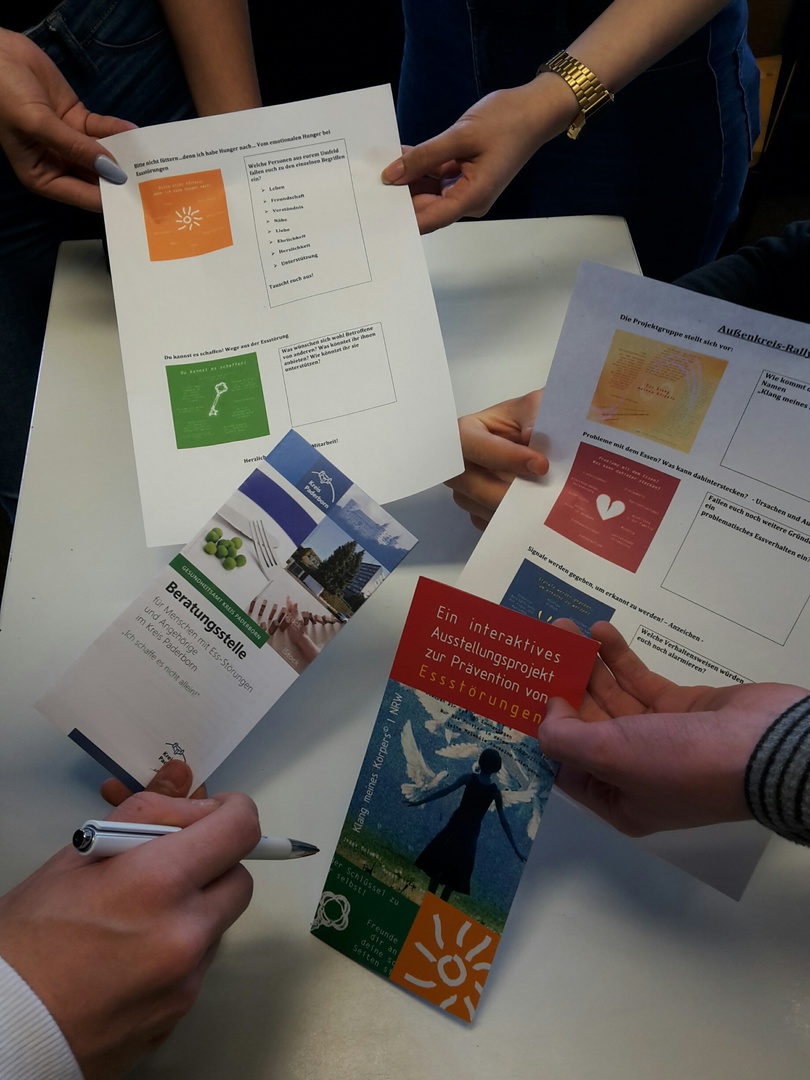 "Wir haben eine Essstörung, aber wir sind keine - und wollen darüber sprechen" lautet die Beschreibung der Jugendlichen, die diese Ausstellung gemeinsam mit ihrer Therapeutin entwickelt haben. Durch eine einfühlsam gestaltete Führung durch die Ausstellung erlangten die Schülerinnen und Schüler fachliche Informationen rund um das Thema Essstörungen, sprachen besonders intensiv über den angemessenen Umgang mit den Betroffenen und lernten auch mögliche Hilfangebote in Problemsituationen kennen.