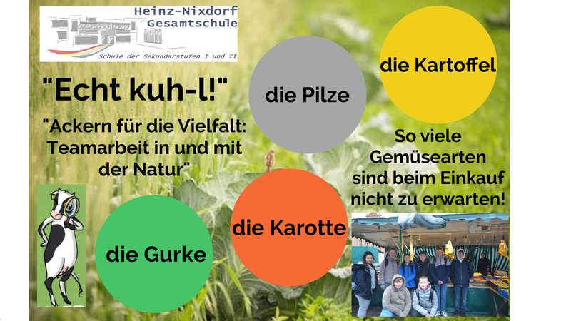 Nach dem großen Erfolg der HNGE im letzten Jahr nimmt auch dieses Jahr der WPNW-Kurs des Jahrgangs 8 unter Leitung von Frau Dräger wieder am bundesweiten Schülerwettbewerb „Echt kuh-l!“ teil. Diesmal steht alles unter dem Thema „Ackern für die Vielfalt: Teamarbeit in und mit der Natur“. Die Schülerinnen und Schüler befassten sich getreu dem diesjährigen Motto mit der Artenvielfalt verschiedener Gemüsesorten (Gurke, Karotte, Pilze und Kartoffel). Überrascht von der hohen Anzahl der verschiedenen Sorten stellten sich die Schülerinnen und Schüler sofort die Frage, welche dieser Sorten für sie auch auf dem lokalen Markt verfügbar sind. Entsprechend führten sie eine Umfrage zur Anzahl und Art der Gemüsesorten bei den hilfsbereiten Betreibern der Marktstände in Paderborn durch. Ihre Ergebnisse fassten sie mit Hilfe der Präsentations-Plattform Prezi unter dem Titel „So viele Gemüsearten sind beim Einkauf nicht zu erwarten!“ zusammen. Die Prezi-Präsentation ist nun offiziell auf der Plattform „Prezi“ für die gesamte Öffentlichkeit verfügbar und auch auf unserer Homepage einsehbar.