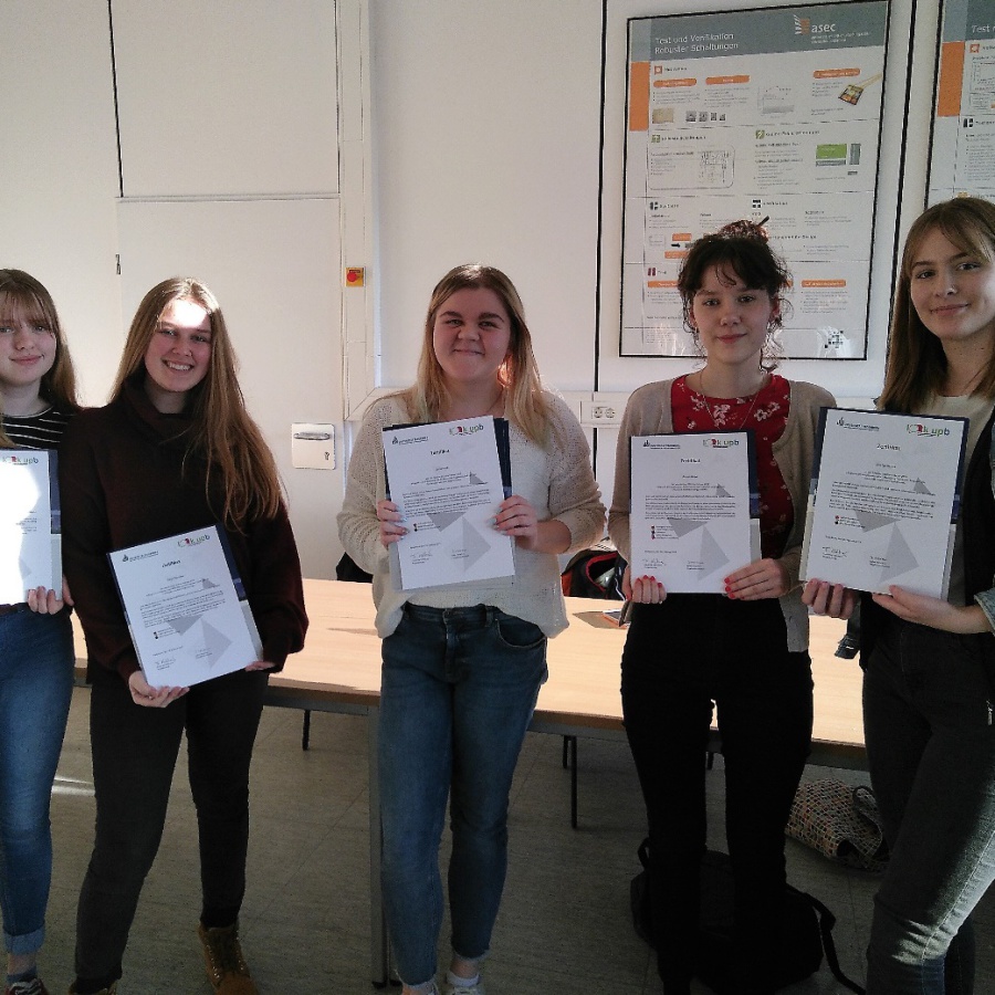 Im vergangenen halben Jahr besuchten sechs Schülerinnen aus der neu aufgebauten Oberstufe der Heinz-Nixdorf-Gesamtschule erstmalig das MINT-Mentoring- Programm an der Universität Paderborn. Das Programm bietet einen praxisnahen Einblick in die MINT-Studiengänge der Universität. Studentinnen eines naturwissenschaftlichen oder auch technischen Studiengangs standen je einer Schülerin als Mentorin ein ganzes Semester lang zur Seite. Zusammen besuchten sie Vorlesungen und Seminare und zeigten den Schülerinnen den Campus, die Labore, die Bibliothek und vieles mehr. Zusätzlich wurde den Schülerinnen im weiteren Rahmenprogramm eine Tages-Exkursion zu Phoenix Contact in Schieder und die Teilnahme an einem Workshop zur Programmierung eines Roboters ermöglicht. In der Abschlussveranstaltung erhielten Schülerinnen dann ihre Zertifikate für ihre erfolgreiche Teilnahme. Wir freuen uns für Darja Davydov, Annet Geier, Julia Heck, Viona Holtz, Evelyn Krone und Laura Sophie Paris!