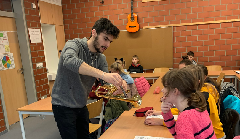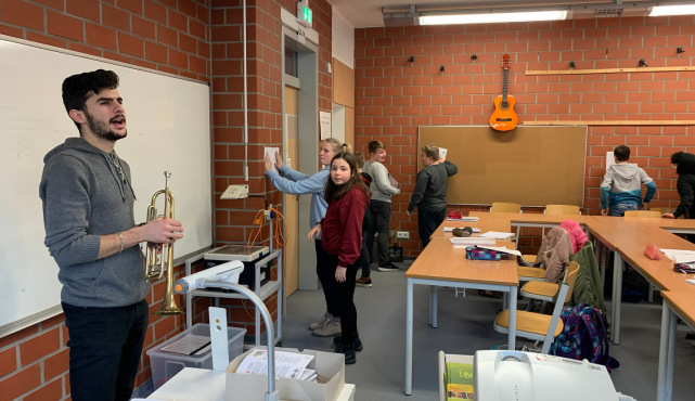 Unser Oberstufenschüler Gabriel Rachko, zeigte und erzählte den Schülern der 6B, wie Blasinstrumente funktionieren. Hierzu spielte er