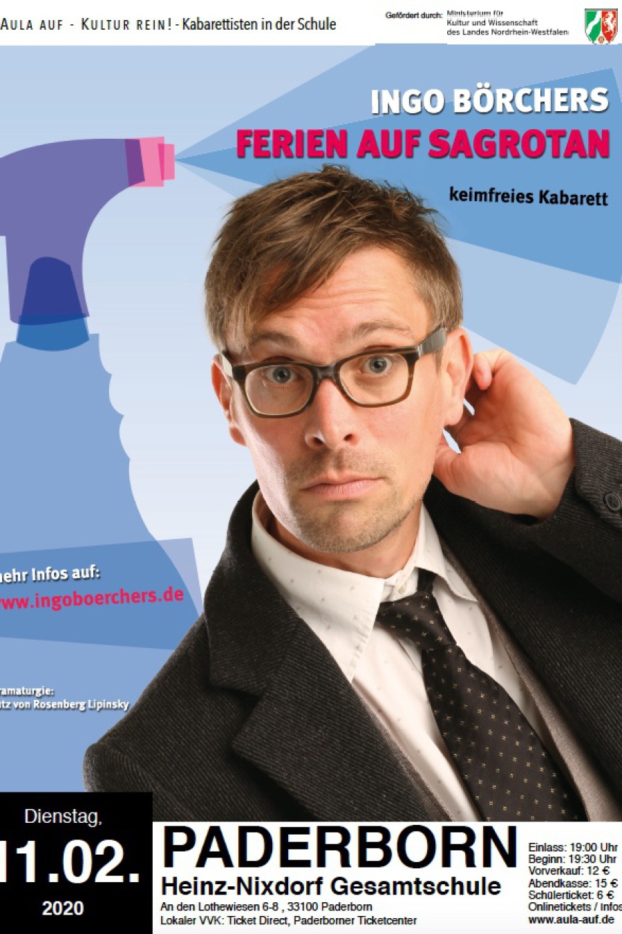 Am Dienstag, den 11.02.2020 findet in unserer Aula um 19.30 Uhr ein Kabarettabend statt. Ingo Börchers präsentiert sein Programm „Ferien auf Sagrotan“.