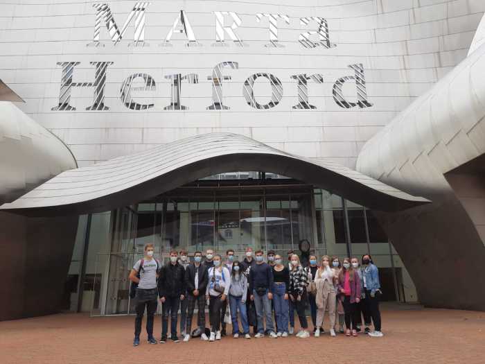 gestattete, wurde zeitnah eine Fahrt ins Marta nach Herford geplant. So begrüßte das euphorische Team des Museums für zeitgenössische Kunst die 19 SchülerInnen und Schüler der Q1 mit ihren zwei