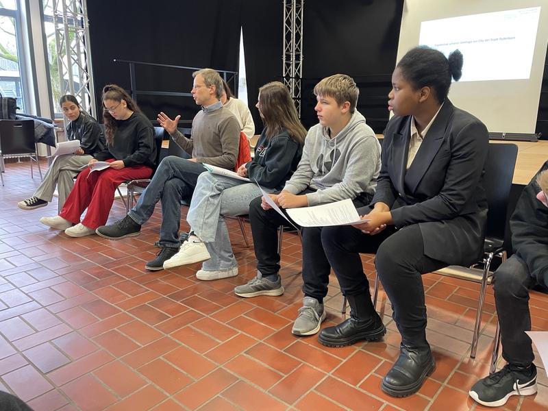 Die Schülerinnen und Schüler konnten einen Einblick in den Berufsalltag des Citymanagers gewinnen und erfahren, inwieweit der Citymanager ein besonderes Augenmerk auf die Kooperationen zwischen verschiedenen Akteur/innen (die Stadt Paderborn, Bürger/innen, Ladenbesitzer/innen, Geschäfte, Politiker/innen usw.) legt. Die Prozesse rund um die Stadtentwicklung in Paderborn wurden den Jugendlichen während des Gesprächs noch einmal deutlicher vor Augen geführt. Außerdem stellte Herr Appelbaum heraus, welchen zukünftigen Veränderungen sich die Paderborner Innenstadt stellen muss. Insgesamt zeigte sich, dass es ein interessantes und gewinnbringendes Gespräch für beide Seiten war.