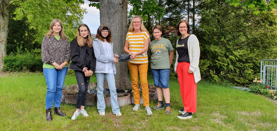 Kunstlehrerin Fr. Himstedt-Keliny, Emely Boxberger, Nicole Wallschmidt, Fr. Bornefeld (Schulmaterialkammer), Jana Rojahn und Kunstlehrerin Fr. Knoop (von rechts)