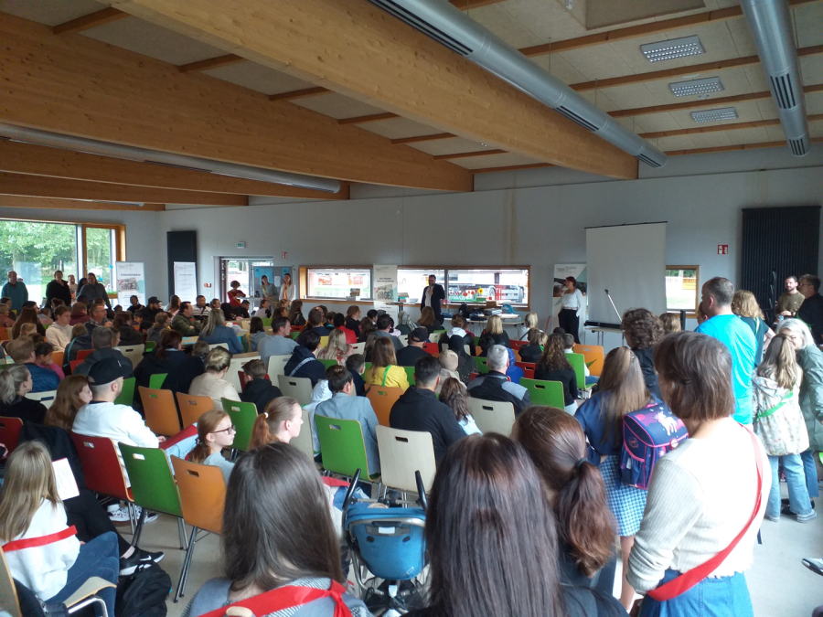Für die neuen Schülerinnen und Schüler fand gemeinsam mit ihren Eltern am Montag zunächst ein Treffen in der Mensa statt. Nach einem Grußwort des Schulleiters Lars Schröder hieß auch die Abteilungsleiterin 5 - 7 Bettina Czaja alle neuen Schülerinnen und Schüler mit ihren Eltern herzlich willkommen! Anschließend sangen dann alle unter Leitung von Frau Kampelmann und Herrn Strickling ein eigens für den Tag umgedichtetes Lied, bevor sich die Klassenlehrerinnen und Klassenlehrer mit den Klassen in die neuen Klassenräume aufmachten. Während die Schülerinnen und Schüler einen ersten Eindruck von ihrer neuen Schule und ihren Lehrerinnen und Lehrern gewinnen konnten, hatten die Eltern die Möglichkeit, sich an einem Stand des Fördervereins mit Getränken und internationalen Speisen zu versorgen und Fragen zur Schule zu stellen.