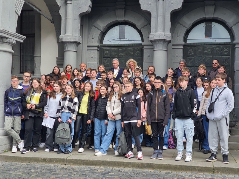 Um 15h erwartete uns der stellvertretende Bürgermeister Herr Honervogt zu einem offiziellen Empfang im großen Saal, wo die französischen Schüler und eine kleine Gruppe deutscher Schüler und natürlich die Lehrpersonen neben einer Erfrischung Informationen zu der Geschichte der Stadt Paderborns und ihre heutige Bedeutung erhielten. Herr Honervogt zeigte sich sehr gerührt, als er von Frau Stanczak die in Frankreich vom Bürgermeister bei offiziellen Empfängen getragene Schärpe der Trikolore überreicht bekam, die ihm Herr Groppe, dem Ritter der akademischen Palme, verliehen für über 40 Jahre Schüleraustausch mit Frankreich, anlegte. Wie in der Rede Herrn Schröders am Vormittag legte auch Herr Honervogt den Fokus auf die Bedeutung von Austausch junger Menschen für eine Zukunft in Frieden.