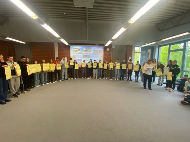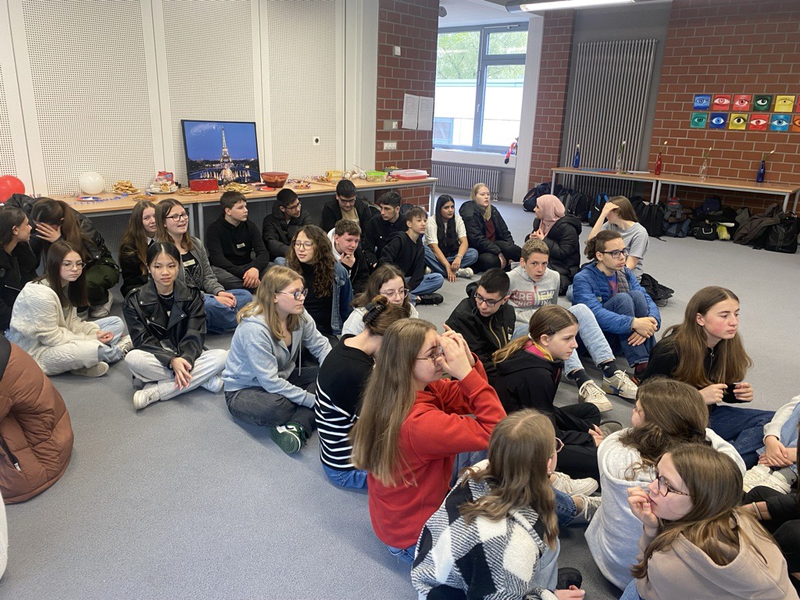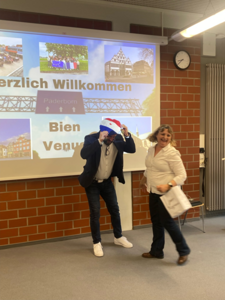 Am Montag wurden die Franzosen herzlich von Schülern, Lehrern und der Schulleitung empfangen. Es gab wie immer viele Geschenke. Madame Stanczak, die für die Originalität ihrer Geschenke bekannt ist, ließ es sich dann auch nicht nehmen, unserem Schulleiter die französische Baskenmütze persönlich aufzusetzen. In seiner Begrüßungsansprache betonte Herr Schröder, wie wichtig der internationale Austausch und die Überwindung von Grenzen in Zeiten von Krieg, Gewalt und Unruhe seien. Persönliche und sprachliche Grenzen gab es dann auch im gemeinsamen Unterrichtsgeschehen und in den Pausen zu überwinden. Abgerundet wurde der Besuch in der Schule mit einem gemeinsamen Picknick, zu dem die Schüler unserer Schule viele leckere Sachen mitbrachten. Nachmittags hatten die Franzosen dann die Möglichkeit, in gemischten deutsch-französischen Kleingruppen die Stadt rund um den Markt zu erkunden, wo sie kleine Aufgaben zu lösen hatten.