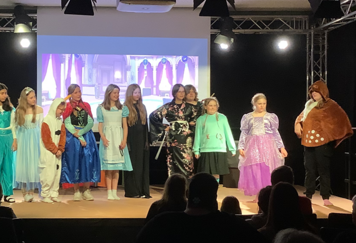 Die Schülerinnen der 5. und 6. Klassen der Musiktheater-AG präsentierten am 02.07.2024 vor einer märchenhaften Kulisse auf der Bühne der Aula des B-Gebäudes das Theaterstück „Happily ever after“.