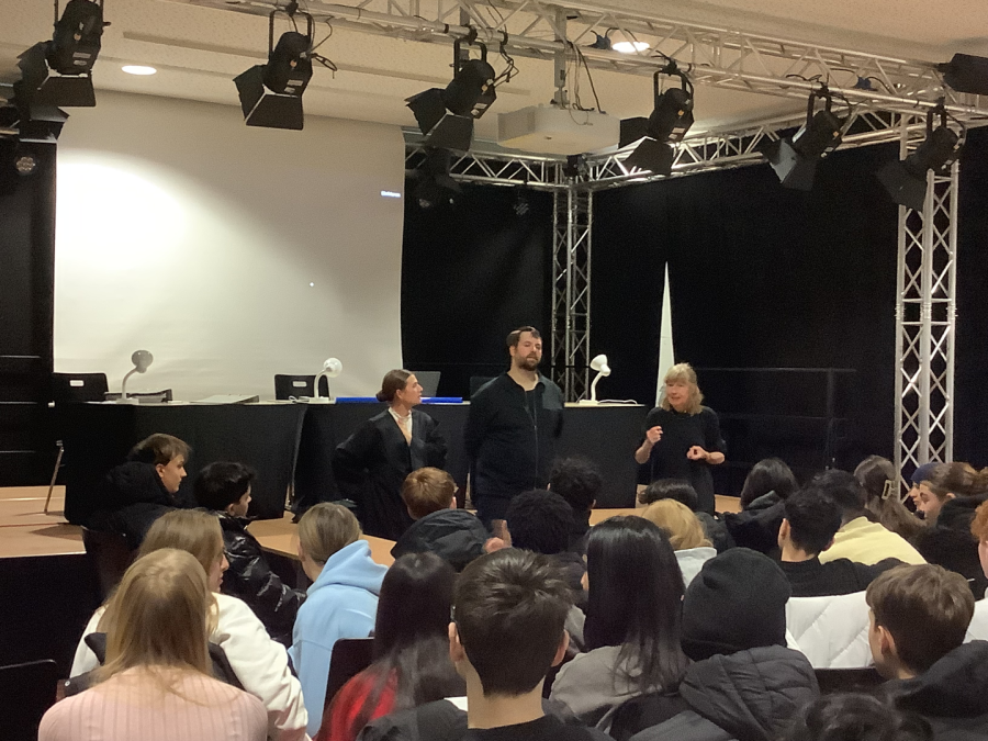 Am 05.12.2024 war das Theater-Ensemble „Exil“ in der HNGe zu Gast und spielte das Stück „Unter Zwang“ in der Aula im B-Gebäude für die Schülerinnen und Schüler des 10. Jahrgangs. Die Schauspieler und Schauspielerinnen Ann-Britta Dohle, Marius Meschede und Lisa Hofmann präsentierten das Stück in zwei Teilen.