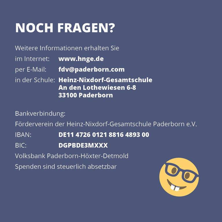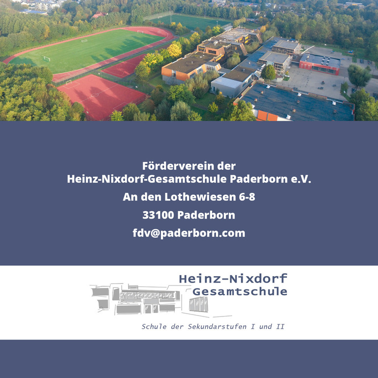 Der Förderverein Heinz-Nixdorf-Gesamtschule Paderborn e.V. hat sich zum Ziel gesetzt schulische Arbeit in materieller, finanzieller und ideeller Hinsicht zu unterstützen. Unsere Arbeit setzt überall da an, wo es gilt, das Lernen und Leben in unserer Gesamtschule zu bereichern. Durch die Zusammenarbeit von Mitgliedern der Schule und engagierten Eltern haben wir in den letzten Jahren unter anderem den jährlich stattfindenden "Tag der offenen Tür", den "Sponsoren Lauf", das "Sport und Spielfest" und verschiedene Projekte des Unterrichts unterstützt und damit zu einer Bereicherung des Schullebens beigetragen.