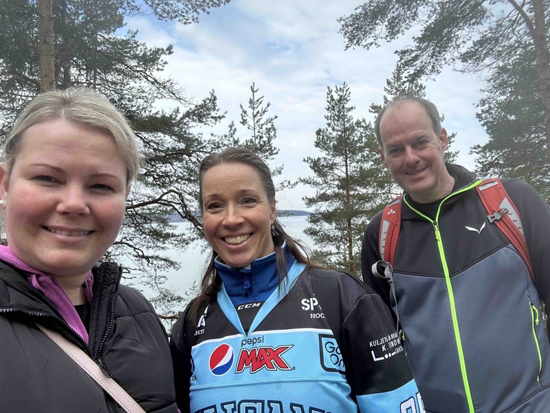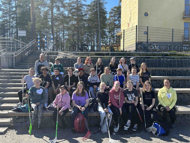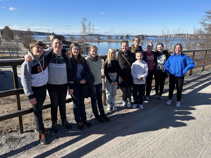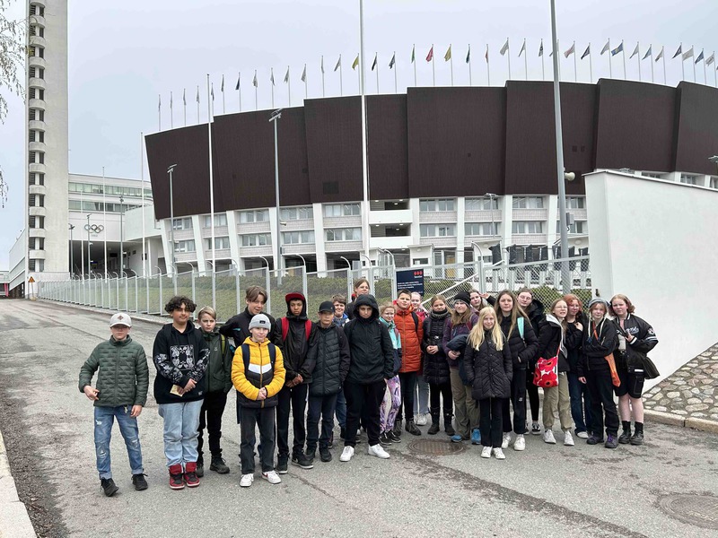 Auf dem abwechslungsreichen Programm standen u.a. Floorball (Ähnlichkeit zur Sportart Hockey), Disc Golf, Basketball, Spaziergänge in der Natur (u.a. zum Skulpturenwald), Besichtigungen von Sport- und Skimuseen in Lahti und Helsinki, Stadtrundgänge sowie Kennenlern- und Sprachspiele. Darüber hinaus lernten die 10 deutschen Schüler*innen das Schulsystem in Finnland kennen und konnten Vergleiche zu unserer Gesamtschule ziehen. Beispielsweise zieht man beim Betreten der Schule seine Schuhe aus und läuft den ganzen Tag auf Socken durch das Gebäude. Desweiteren gilt das Lehrerraumprinzip, jeder Schüler hat einen einzelnen Platz zum Lernen und ein digitales Endgerät (meistens Laptop) zur Verfügung. Sehr beeindruckt waren wir vom Außengelände der Schule, welches u.a. eine Skilanglaufstrecke enthält oder im Winter auch zum Eishockeyfeld umfunktioniert werden kann. Ein Highlight war sicherlich das gemeinsame Anfeuern der Lahti Pelicans (lokales Eishockeyteam) beim Finalspiel gegen Tampere, das wir live aus dem Auditorium der Schule verfolgen durften. Landschaftlich gesehen gefiel uns die Nähe zum See Veijärvi sehr gut, sodass sowohl tagsüber als auch abends die malerische Kulisse zum beliebten Fotomotiv wurde.