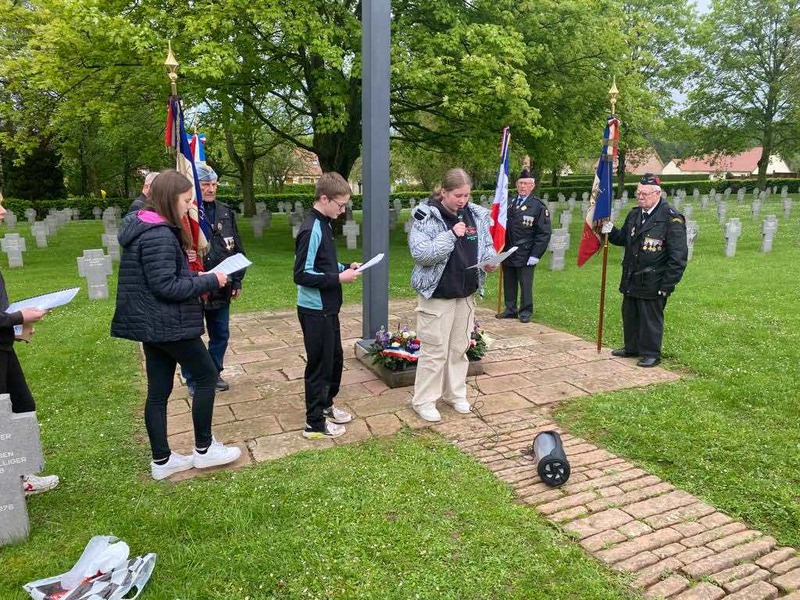 Gedenkfeier mit dem Bürgermeister von Moreuil und Kriegsveteranen auf dem deutschen Soldatenfriedhof, dem anlässlich des Feiertages am 08. Mai ein besonderes Gewicht zukam. Deutsche und französische