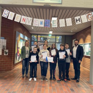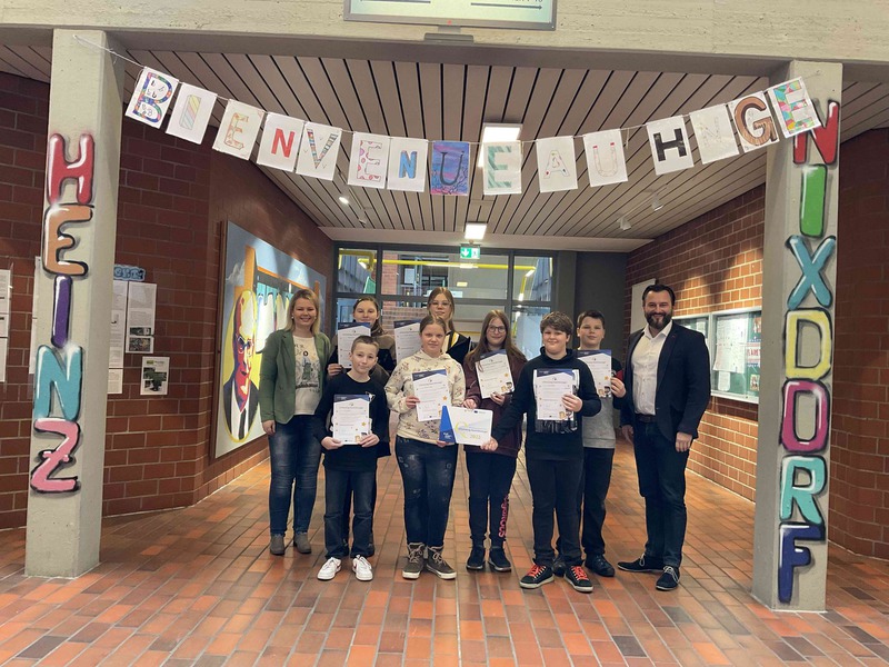 Beteiligt an dem gewinnbringenden Projekt waren Nils Killian, Hannah Anderson, Fabienne Engler, Amelie Hagendorf, Tyler Fiebig, Valeria Klimov und Simon Möller. Während alle 7 Schüler*innen ein Zertifikat und einen Sachpreis erhielten, durften sich Projektleiterin Daniela Meier und Schulleiter Lars Schröder über ein weiteres Siegel im Fremdsprachenbereich freuen. Zudem darf die Schule eine Sachspende in Höhe von 300,-€ für Fördermaterialien ausgeben.