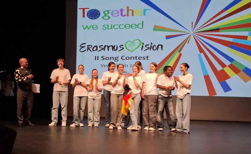 Doch bevor wir uns so richtig auf unser Vorhaben einlassen konnten, rückte die „Erasmusvision“ in den Fokus unserer Bemühungen: Auf der Gran Canaria und Teneriffa fanden zeitgleich mehrere Austauschprojekte von Erasmus statt. Alle daran beteiligten Schülerinnen und Schüler waren am Mittwoch, den 5. Februar ins Theater von Vecindario eingeladen und aufgefordert, einen Beitrag aus ihrem Land in Form eines Videos über die demokratischen Strukturen an ihrer Schule zu präsentieren und ein selbst geschriebenes Lied über europäische, demokratische Werte zu einer bekannten Melodie zu performen. Dieser Herausforderung stellte sich unsere Gruppe mit Mut und Humor, Einfallsreichtum und Taktgefühl und eröffnete mit ihrem Lied „Demokratie“ den Wettbewerb, an dem insgesamt acht Gruppen teilnahmen. „Es war alles viel größer als gedacht!“ Das stimmte. Sogar das Fernsehen war da.