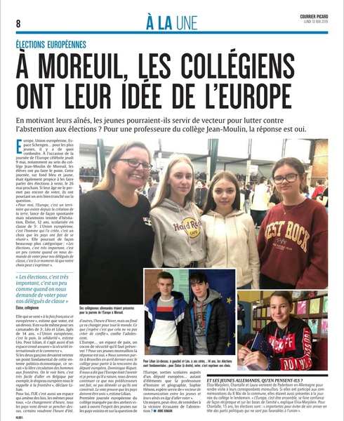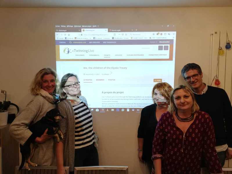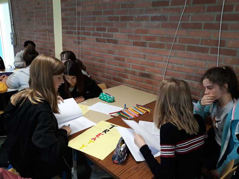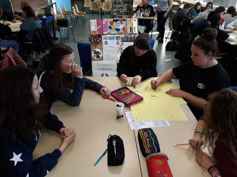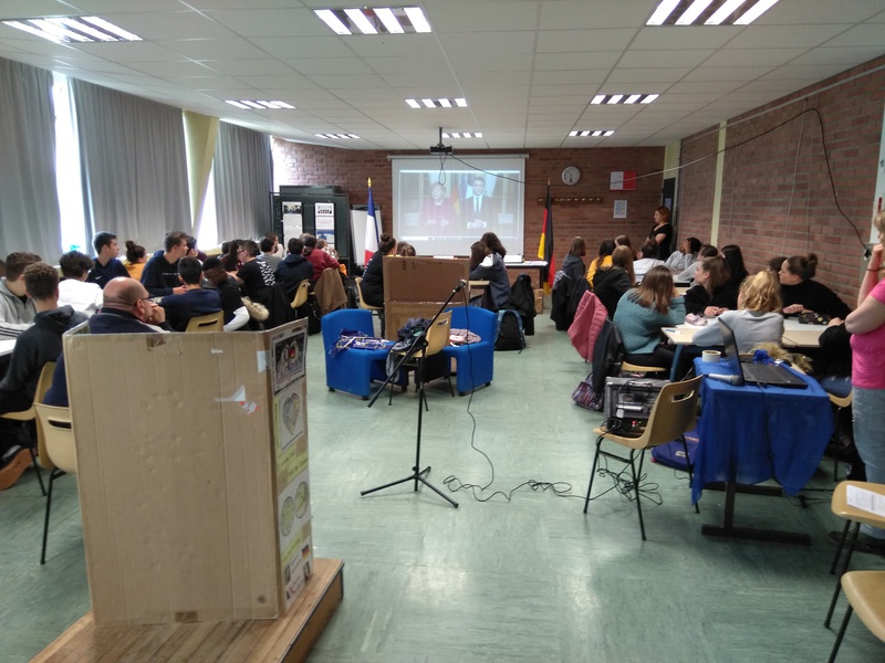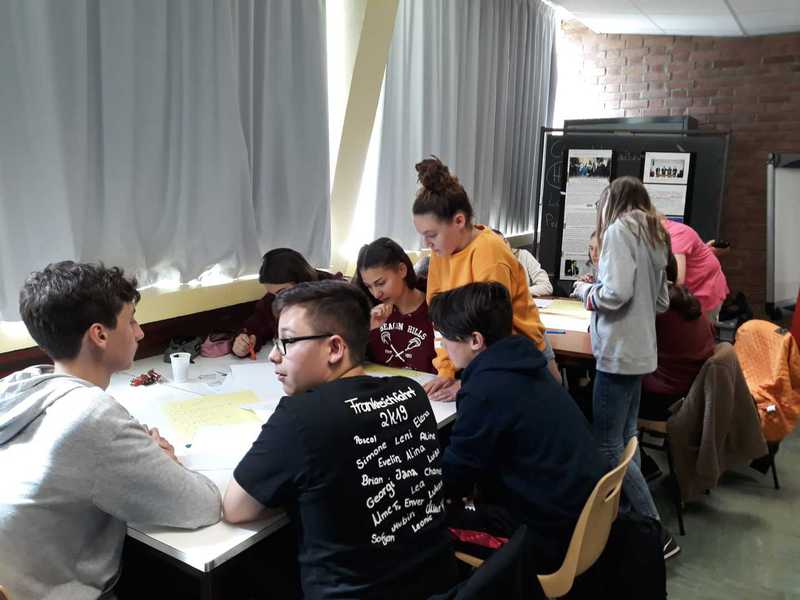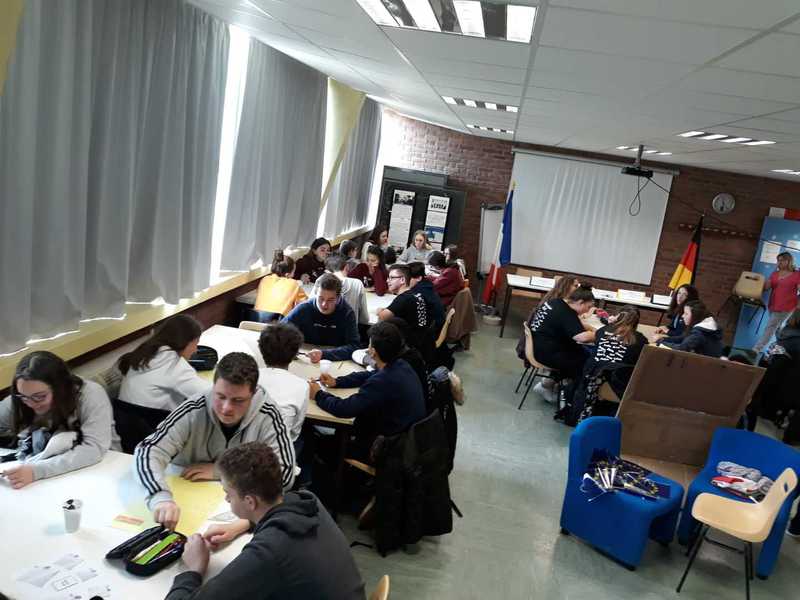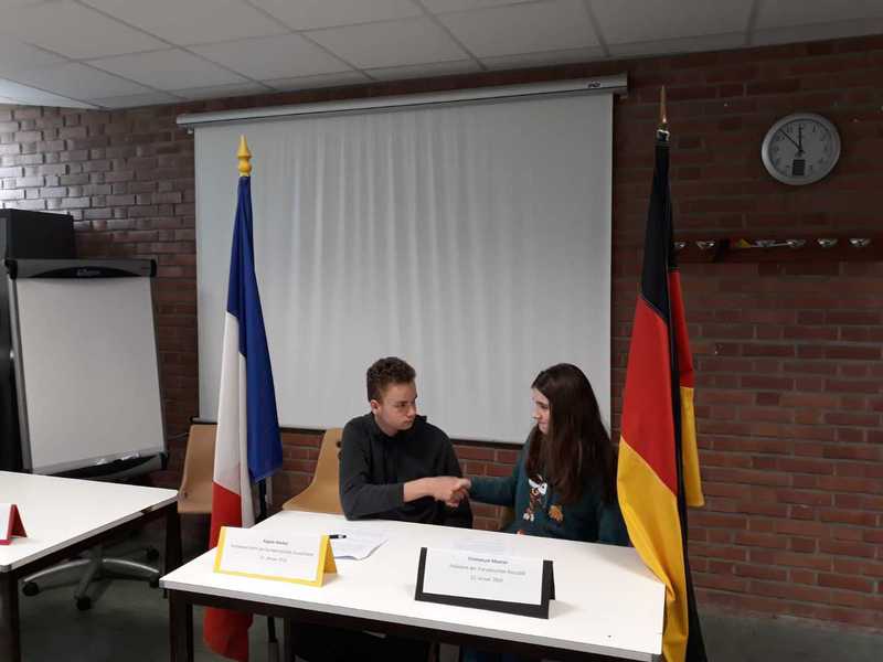 Das nächste deutsch-französische Treffen fand am nächsten Tag im Collège Jean Moulin in Moreuil statt. Nach unserer Ankunft nahmen die deutschen Schüler zunächst eine Stunde am regulären Unterricht teil, dann trafen wir uns im salle de réunion wieder, um unser gemeinsames eTwinning-Projekt „We, the children of the Élysée Treaty“ zu beenden. Zunächst schauten wir uns dazu die gemeinsame Erklärung von Bundeskanzlerin Angela Merkel und dem französischen Präsidenten Emmanuel Macron anlässlich des 55. Jahrestages der Unterzeichnung des Élysée-Vertrages an. Anschließend fertigten die Schüler in deutsch-französischen Kleingruppen dreisprachige Akrosticha an und spielten die Unterzeichnung des Aachener Vertrags vom 22. Januar 2019 nach. Dies wurde in kurzen Videos festgehalten.