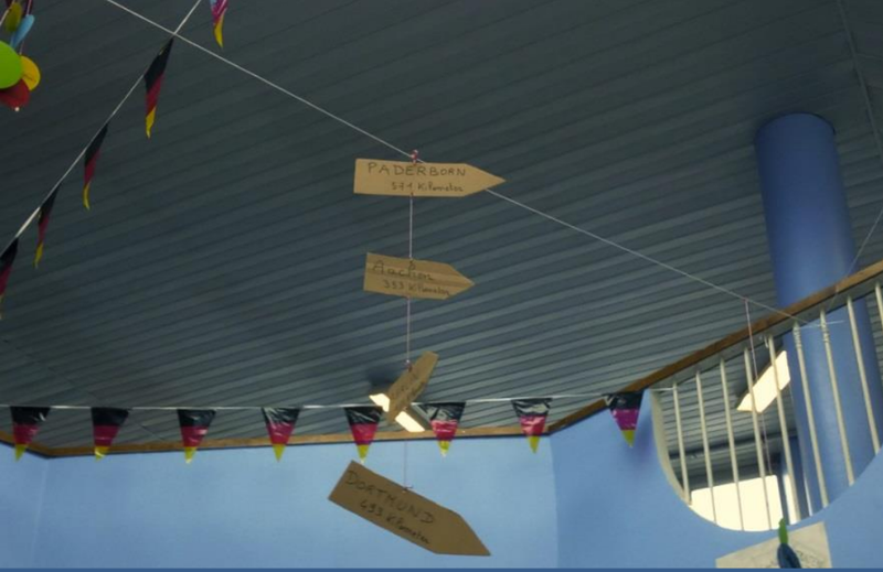 Nach einem europäischen Essen mit den corres in der cantine durften die deutschen Schüler zwischen 14 und 16 Uhr an den Projekten teilnehmen, die die Schule am Europatag organisiert hatte. Wir übten einen Tanz und die Europahymne ein und sahen eine Modenschau, in der die 28 europäischen Mitgliedsstaaten dargestellt wurden. Um 16 fanden sich alle Schüler und Lehrer in der Sporthalle ein und die einstudierten Lieder und Tänze wurden vor der versammelten Schulgemeinde aufgeführt. Der Tag endete auf dem Sportplatz, wo wir die französischen Schüler dabei unterstützten, die europäische Flagge mit Hilfe von blauen Pappen und gelben Sternen darzustellen.