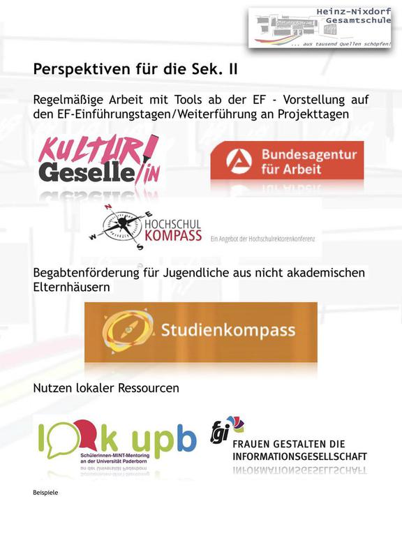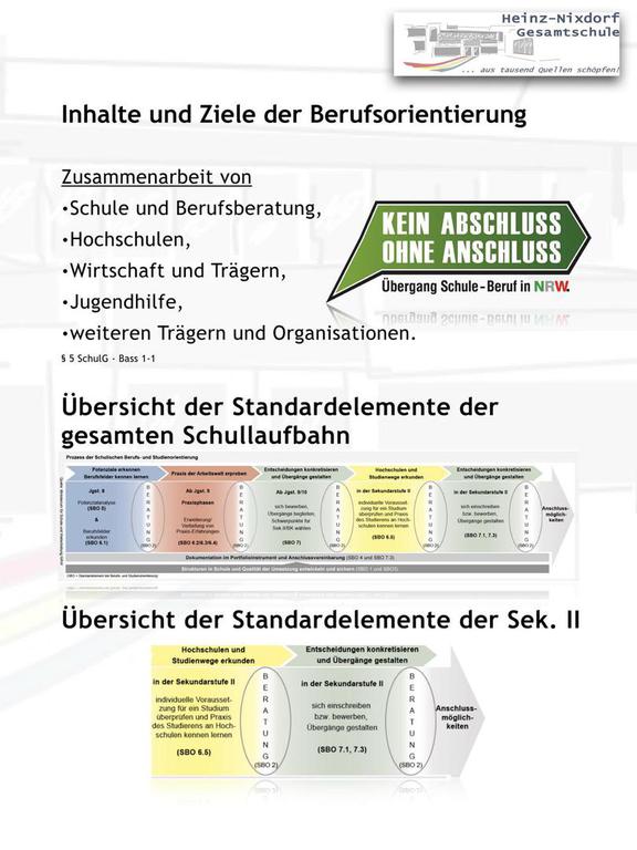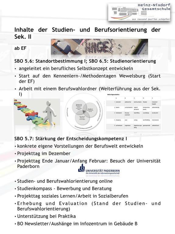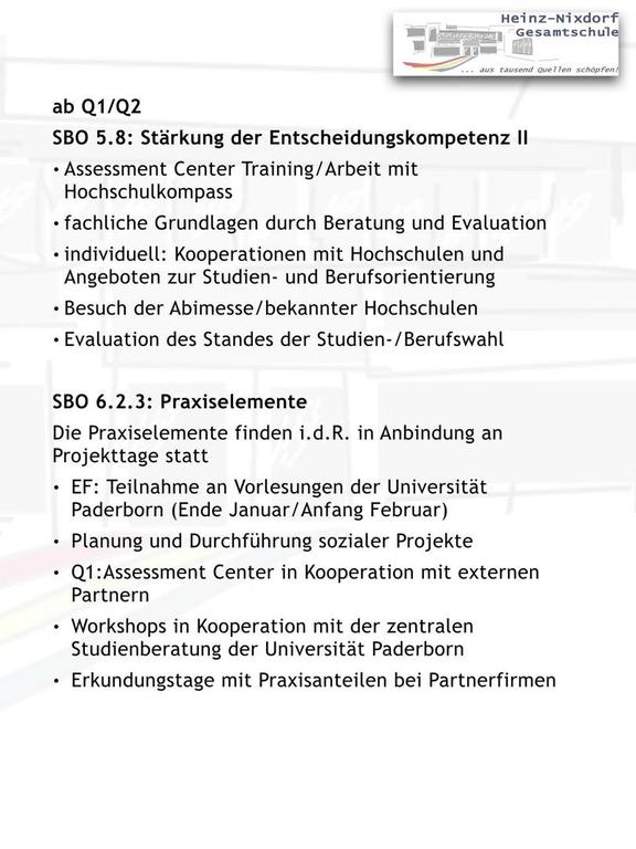 Im Rahmen der Studien- und Berufswahlorientierung in der Sek. II der Heinz-Nixdorf-Gesamtschule erfahren unsere Schülerinnen und Schüler theoretische wie praktische Einsichten in die Zeit nach dem Abitur. Das Nutzen lokaler Ressourcen steht dabei im Fokus. Schülerinnen und Schüler sammeln Erfahrungen in Praxisphasen bei Partnerunternehmen sowie an ortsansässigen Hochschulen. Neben obligatorischen Elementen stehen besonders auch eigene Wünsche der Schülerinnen und Schüler im Vordergrund. Wir beraten und unterstützen jeden Einzelnen bei individuellen Interessen und Ambitionen auf dem Weg zu einer erfolgsreichen Perspektive.