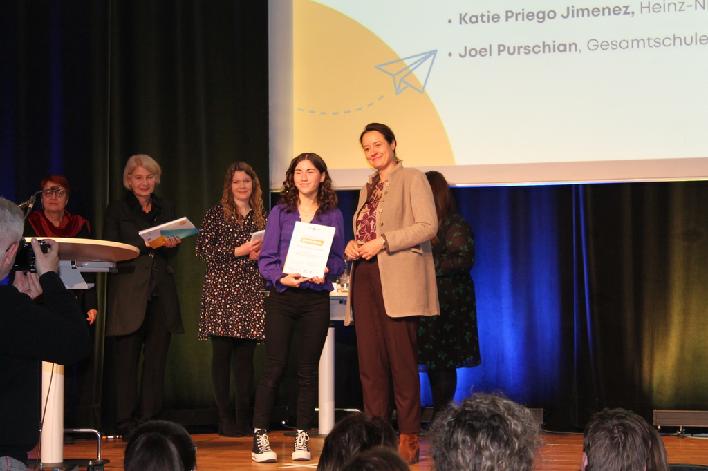 Katie Priego-Jimenez (EF) ist offiziell am Samstag, 19.11.2022 in das Förderprogramm „NRW-Talente“ aufgenommen worden. Ihre Urkunde wurde ihr im Rahmen der offiziellen Feier in der Stadthalle Gütersloh verliehen durch Anna Katharina Bölling, Regierungspräsidentin für den Regierungsbezirk Detmold. Sie erhält in den folgenden Jahren Zugang zu Beratung, zusätzlichen Kursangeboten und finanzieller Unterstützung durch die NRW-Talente. Frau Hofacker, Oberstufenleiterin der Heinz-Nixdorf-Gesamtschule ist begeistert, dass Katie Priego-Jimenez als eine von 50 Schülerinnen und Schülern in OWL in das Programm aufgenommen wurde und eine hervorragende Förderung erhält.