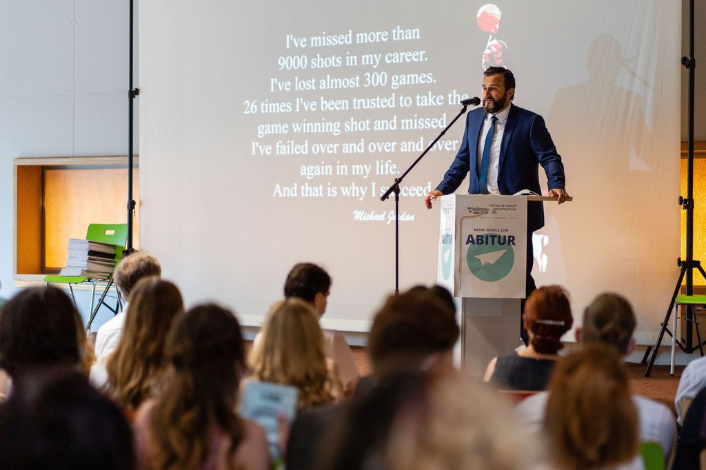 Mit den Worten „Ihr habt Mut bewiesen!“, zeigte sich der stellvertretende Schulleiter Lars Schröder stolz auf den ersten Abiturjahrgang der noch jungen Gesamtschule. Dabei verwies er sowohl auf die besondere pandemiebedingte Situation, unter der die Absolvent*innen lernen mussten, als auch auf die zukünftigen Herausforderungen, die sich den jungen Erwachsenen stellen. Das unterstreicht auch Andrea Reck, die ihre herzlichen Grüße ausrichtet. Die Schulleiterin, die die Schule seit ihrer Gründung 2012 maßgeblich aufgebaut hat, konnte krankheitsbedingt leider nicht an den Feierlichkeiten teilnehmen. „Ich freue mich und blicke mit Stolz auf unseren ersten Abiturjahrgang! Ich wünsche den jungen Erwachsenen alles Gute für Ihre Lebenswege.“, richtet die erfahrene Pädagogin, die mit Schuljahresende in den Ruhestand geht, aus.